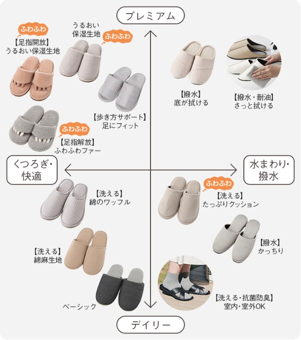 KEYUCA备有种类丰富的功能性拖鞋,可根据生活场合进行选择。