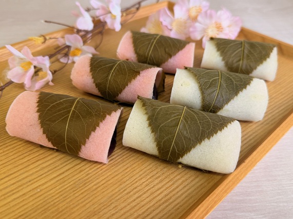 用樱叶包裹红豆沙。