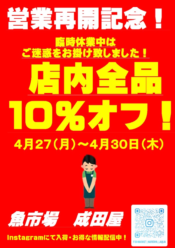 这里是来自成田屋鱼市场LaQua(综合商业设施)店的报告。