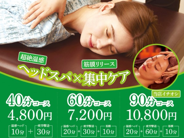 击退疲劳+超绝睡眠头部水疗 90分钟 10,500日元