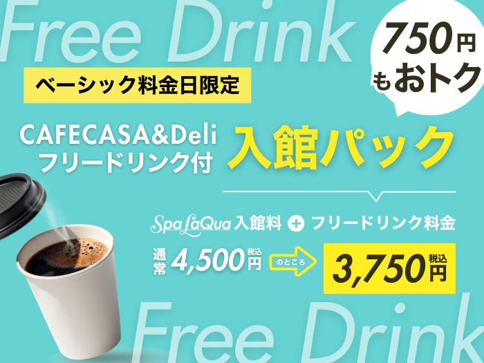 Spa LaQua(温泉水疗会馆)位于LaQua(综合商业设施)的5楼Cafe Casa&Deli正在销售“时间段限定的免费饮品1,000日元(店铺营业时间至17:00※)”。