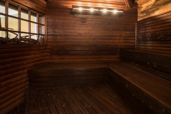 位于男性浴室内,充满氛围的正宗桑拿室。